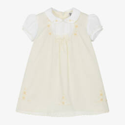 The girls pale pink dress by Sarah Louise is crafted from a soft and lightweight cotton blend. With a fully lined interior and a gentle A-line silhouette, it features charming puffed sleeves, a Peter Pan collar, and a pintuck bib adorned with a bow. The hand-embroidered floral design adds a touch of elegance. A concealed zip at the back ensures easy dressing. Limited quantities available—perfect for special occasions in the spring and summer.