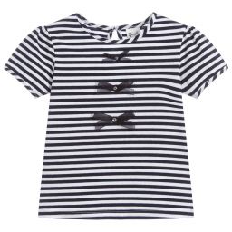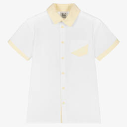 Girls pretty white T-shirt from Sarah Louise, made in soft cotton jersey. It has floral embroidery in yellow, green and blue, with yellow grosgrain bows and matching floral trim on the neckline and cuffs. The sleeves are puffed and there is a single button fastening on the back.