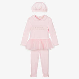White bodysuit and pink leggings set for baby girls from Sofija, a design exclusive to Childrensalon. Both are made in beautifully soft cotton jersey and trimmed with lovely frills. The long-sleeved bodyvest has a charming deer print on the front, complete with diamanté and fabric flowers. It fastens with easy-to-use poppers on the shoulders and between the legs. The leggings have an elasticated waist for quick nappy changes.