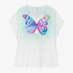 Girls white butterfly kaftan by Stella Cove is exclusive to Childrensalon. This pretty kaftan features striking green and orange paint splatters with a bright butterfly print on the front and back, creating an eye-catching look. The flattering V neckline and wide sleeves make it ideal for keeping cool and covered in the sunshine. Limited quantities available.