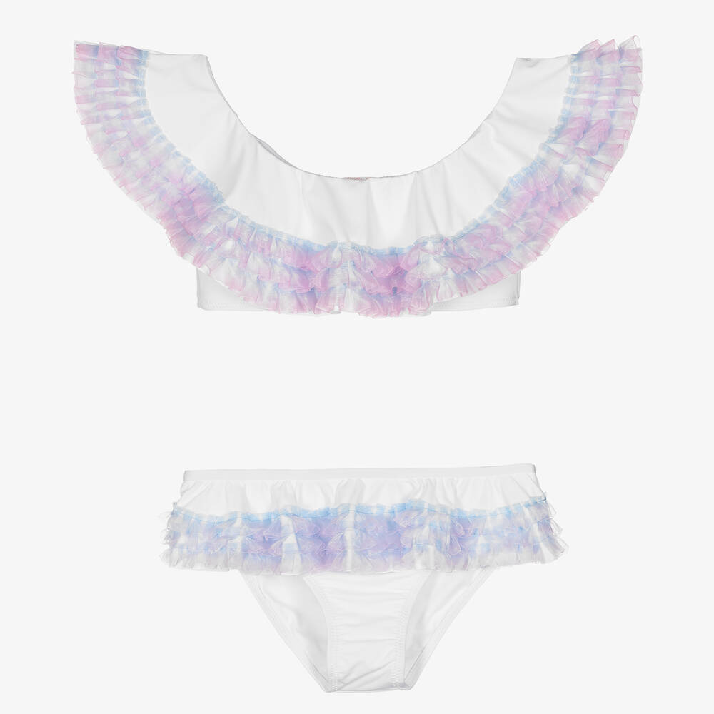 Teen girls white frilled bikini by Stella Cove features soft and stretchy fabric with pink and blue ombré organza frills. The top can be worn off-the-shoulder for a versatile look, while the bottoms have an elasticated waist for comfort. Fully lined and perfect for summer days, this bikini offers both style and practicality. Limited quantities available, last chance to buy!
