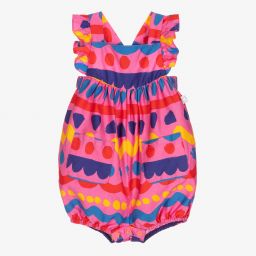 Cute turquoise blue shortie for girls by British designer Stella McCartney Kids, with a colourful crab print. It is made in lightweight organic cotton voile, with frills over the shoulders. The sides and leg cuffs are gently elasticated.