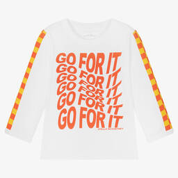 Boys white organic cotton top by British brand Stella McCartney Kids. This long-sleeved top is made in soft and stretchy jersey, with orange and black sporty motocross-style logo graphics on the front and sleeves. It has a ribbed crew neckline and cuffs for a casual look.