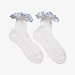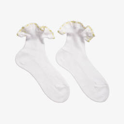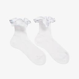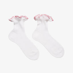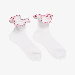 Girls white cotton socks with red ribbon ruffles by Story Loris. Finely woven in soft cotton, these pretty socks have delicate organza and red ribbon ruffle trims at the ankles.