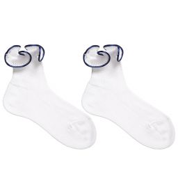 Girls white and purple ruffle socks by Story Loris. These super fine weave socks are made in pure cotton and have a delicate ruffle trim, edged in purple.