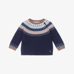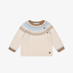 This boys classic Fair Isle jumper by Tartine et Chocolat is crafted from soft, knitted wool, offering warmth and comfort for the autumn and winter seasons. Featuring a charming Fair Isle pattern in soothing beige and blue tones, it adds a touch of timeless style to any wardrobe. The easy-to-use button fastening ensures a snug fit, making it an ideal choice for layering on chilly days. Act quickly, as limited quantities are available for this luxurious piece.