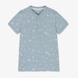 Grey polo shirt for boys by Tartine et Chocolat, made in soft and stretchy cotton piqué. Cool and comfortable, it has a white all-over tennis-themed design and a rubberised logo patch on the chest. There are white striped trims on the ribbed collar and cuffs and logo-branded button fastenings on the front.