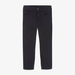 A pair of muted pale green trousers for younger boys from Tartine et Chocolat. Ideal for both smart and casual wear, these cotton twill trousers are soft, stretchy and adjustable with buttons on the inner waist for comfort. A blue and white Garda stripe tab and small logo patch stitched on the back pocket add subtle designer details.