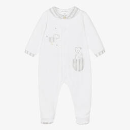 Cute pink cotton babygrow for girls by traditional French brand Tartine et Chocolat, made in super soft velour. It has a pink and white striped poplin collar, with a matching chest pocket and cloud appliqué on the front. A sweet bear sits in the pocket, whilst stars are printed around the cloud, with a logo charm sewn below. The babygrow has coordinating, striped trims on the buttoned cuffs and the soles of the feet. There are easy-to-use popper fastenings on the front and between the legs for easy dressing.