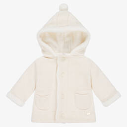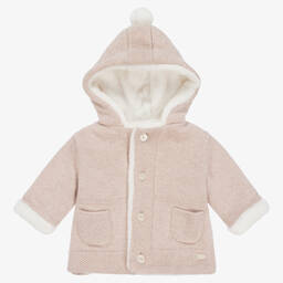 Cosy grey hooded pram coat for baby boys and girls by classic French brand Tartine et Chocolat. Knitted in a soft cotton, wool and cashmere blend, it has sweet moss stitch detailing and front patch pockets. There are logo button fastenings and a logo charm sewn by the hemline. The hood has a super soft, white faux fur pom-pom on top, coordinating with the warm, faux fur lining.
