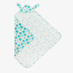 Ivory blanket for baby girls by The Bonnie Mob, with a fun cherries pattern in bright pink and green. Made in super soft and gentle organic cotton jersey, this cosy wrap has a hood trimmed with cute ears.