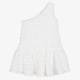 Pretty black dress by Swedish brand The Tiny Universe, in a stylish, one-shoulder design. Lightweight and stretchy, with an eye-catching, textured square pattern, it is elasticated around the neckline for a good fit. The full, drop-waisted skirt has a satin lining with a little tulle for volume. On the back is the designer's logo tab.
