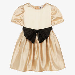 Red dress for girls by The Tiny Universe, made in shiny and silky satin. It is classically styled with cap sleeves and A-line skirt lined with tulle for added volume. The large contrasting bow belt catches the eye and adds a fun finish to the look. A concealed zip fastening on the back allows for easy dressing and a seamless finish.