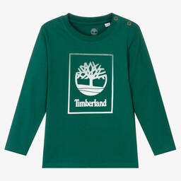 Little boys red long-sleeved top by Timberland, made in soft organic cotton jersey. The front has the brand's iconic tree logo gradient print in white and there are branded poppers on one shoulder in antiqued silver finish.