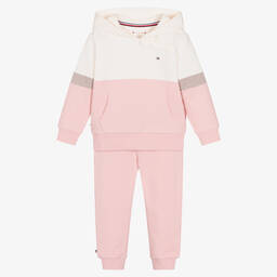 Aqua green and royal blue tracksuit for baby boys by American brand, Tommy Hilfiger. Made in comfortable, lightweight cotton sweatshirt jersey, both pieces have branded details for a discreet designer touch. The hooded top has popper fastenings on the front shoulder and a pouch pocket on the front. The cuffed joggers have a drawstring waist for an adjustable fit, with concealed side pockets and a patch pocket on the back. The cotton in this product is at least 50% organic.