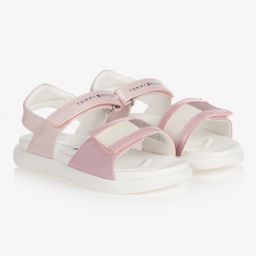 Metallic navy blue velcro sandals for girls by Tommy Hilfiger, with faux leather uppers. There are two velcro straps, one with a logo print, and the other with a glittery red and white trim. They have a moulded rubber footbed and non-slip rubber outer sole.