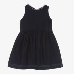 Girls lovely sleeveless dress in off-white by Tommy Hilfiger. Simple and timeless, it is gathered around the waist and trimmed with a beautifully embroidered tonal logo lace around the hemline. The designer's tricolour ribbon trim can be seen around the neck and an enameled logo flag is stitched by the hem for an added designer finish. Super soft and lightweight, it is fully lined for comfort and fastens with a concealed zip on the back. The fabric contains 50% viscose fibers originating from sustainable sources.