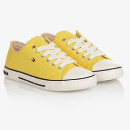 Navy blue lace-up trainers for teen boys and girls by Tommy Hilfiger, made from recycled canvas. With a classic low silhouette, these sneakers have a contrasting white rubber toe cap with the brand's spell-out embossed logo on the heel. There are navy blue striped trims on the side of the sole and the brand's flap logo is embroidered on the side.