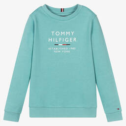 Easy wearing navy blue sweatshirt for teen boys by American brand Tommy Hilfiger, made in comfortable mid-weight cotton jersey. It has a contrast white logo print on the front, and signature tricolour detailing on the back of the neck. The iconic flag logo is embroidered on one cuff.