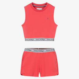 Navy blue shorts set for teen girls by American brand Tommy Hilfiger, with a sporty vibe. Made in a super soft, comfortable, viscose-blend jersey, both the cropped top and shorts have the signature flag logo embroidered on one side and elasticated logo trims. The top has a ribbed neckline and the shorts have jetted side pockets. This product is made with at least 50% FSC certified viscose.
