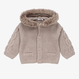 Pale blue knitted cardigan for little boys from Tutto Piccolo, in a chunky cotton blend. Fastening with branded buttons, it has lovely cable detail on the sleeves, faux pockets on the front and beige faux fur trim on the hood for a cosy finish.