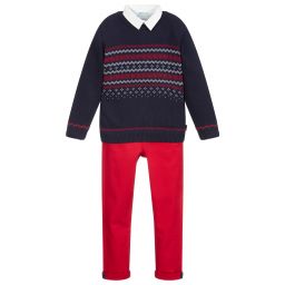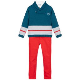 Shirt, sweater and trousers set by Tutto Piccolo. The white cotton shirt has the brand's embroidered logo on one side. The five pocket red trousers are made in stretchy cotton and have a useful adjustable waistband. The pale blue sweater is knitted in cotton and has white and red stripes, an embroidered logo on the back and cable detailing.