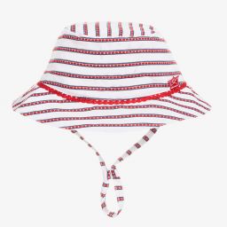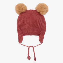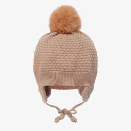 Taupe brown hat for little girls and boys from Tutto Piccolo. Knitted in a lightweight cotton blend, it has ear flaps and knitted ties that fasten under the chin. There are light brown faux fur pom-poms on the top for a cute, casual look on colder days.