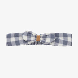 Girls white headband with red and navy blue stripes by Spanish brand Tutto Piccolo. Made in a lightweight cotton and polyester blend, it has a fixed bow on top and is elasticated around the back for a good fit. The designer's logo is embroidered on one side in red.