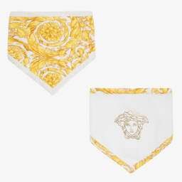 Adorable babygrow and hat gift set for boys by Versace, made in luxury soft ivory cotton jersey. In a soft pastel blue colour palette, the all-over Versace Storybook print is depicting a once upon a time fairytale village with sleepy dragons and cute Medusa clouds. The hat has a turn-up brim and lining in La Greca Signature print to match the accent collar on the popper fastening babygrow. Ideal for gifting, the set is presented in a branded box.