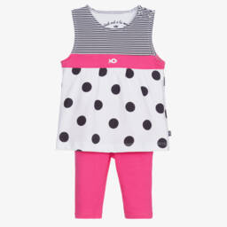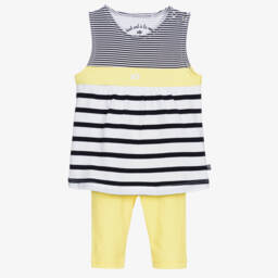 Lovely for younger girls, a white, yellow and navy blue two piece leggings set by Week-end à la mer. Patterned with stripes, the top has a white embroidered logo on the front and poppers on one shoulder. The matching leggings are three-quarter length, with a soft stretchy waist.