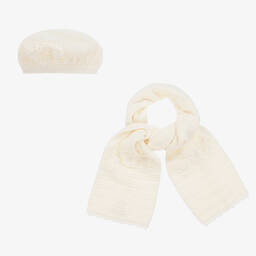 A pale pink beret and scarf set for baby girls by British brand Sarah Louise, in a mid-weight ripple texture knit. This set has a beautifully hand-embroidered floral design in tonal pink with scalloped edging on the scarf, keeping your little one cute and cosy. The beret has a lightweight knitted lining for extra warmth and is gently elasticated for a comfortable fit on the head.