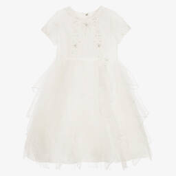A lovely light blue dress for girls by British designer Sarah Louise, made in a soft cotton blend. It is designed in a pretty floral print with beautiful, hand-embroidered smocking across the bodice for a traditional look. Delicate orange and turquoise blue florals, along with intricate stitching can be seen on the white collar. Lined for comfort, it has pretty puffed sleeves and a fixed sash that ties into a bow on the back. The mother-of-pearl buttons on the back add a decorative finishing touch.