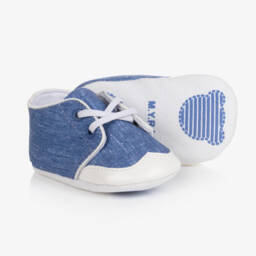 Baby girls adorable ivory pre-walker shoes by Sarah Louise made from a soft, silk organza. Perfect for that special occasion they have a delicate ivory lace trim with ribbon and pearl bow on the front. They are fully lined in a soft towelling, making them comfortable when worn, have a soft, faux leather sole and have ribbon ties to fasten around the ankle.