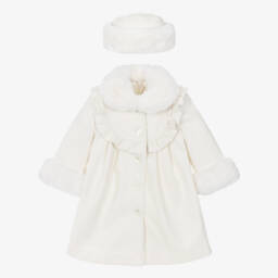Pale pink coat and bonnet set for little girls, by Sarah Louise, made in a soft felted fabric. Both pieces are lined with silky, smooth satin and trimmed with white faux fur. The bonnet fastens with ribbon ties under the neck, which can be detached if needed. The coat has beautiful mother-of-pearl button fastenings.