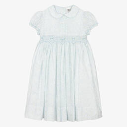 Lovely dress for girls by classic British brand Sarah Louise, with a delightful, pale pink ditsy floral print on a white background. Made in a lightweight cotton blend, it has traditional hand smocking and floral embroidery across the bodice, with decorative buttons and pin tuck detailing. With a scalloped collar and pretty puffed, frilly sleeves, it is fully lined in voile for comfort. It fastens with buttons around the back and a sash that ties in a bow.