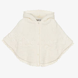 Gorgeous pale pink hooded cape for younger girls from Sarah Louise, crafted in a soft knit with pretty floral detailing. This cosy cape has a knitted lining and is lightly padded for added warmth. It has a pretty scalloped trim and fastens down the front with mother-of-pearl button fastenings.
