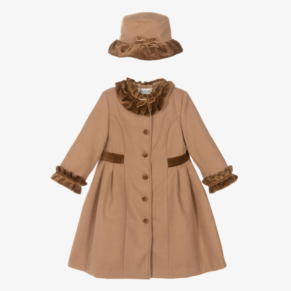 This tan felted coat and hat set for girls by Sarah Louise offers a blend of elegance and warmth, crafted from a super soft viscose blend. The coat features a slightly fitted design with a pleated skirt, enhanced by a bronze velvet waistband and trims, complemented by coordinating button fastenings. Lined with silky satin for added comfort, this set is lovely for chilly days. Limited quantities available, making it a last chance to buy this exquisite set.