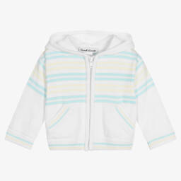 Made in soft cotton velour, a pink hooded zip-up top for younger girls by Sarah Louise. It has pretty floral embroidery, pearl beads and satin bows on the front. There are little hand pockets and a frilled peplum hem.