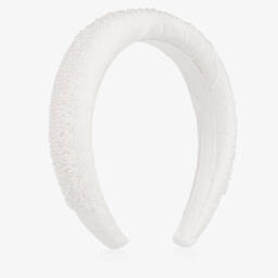 The girls gold metallic bow headband by Self-Portrait is crafted with a luxurious viscose blend, featuring a silky texture. Its narrow, flexible band is elegantly padded, adorned with a large bow that includes a sparkling diamanté floral button. This stylish accessory adds a touch of glamour to any outfit, perfect for special occasions. Limited quantities available, making it a last chance to buy this exquisite piece. Includes a branded storage bag for safekeeping.