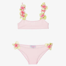A light green flower bikini for girls by swimwear designer Selini Action, handmade in luxuriously soft fabric. This fabulous two-piece features pink and green fabric flower appliqués on the adjustable shoulder straps and sides. Both pieces are lined on the front for extra comfort. The bikini top has an easy-to-use resin clip fastening on the back, and the bottoms have a stretchy waist for simple dressing. Limited quantities available.