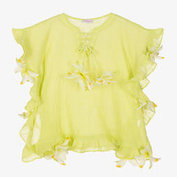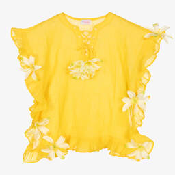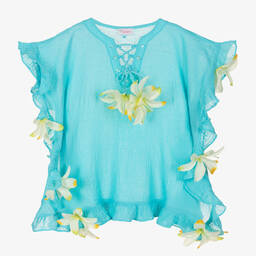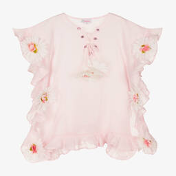 Gorgeous handmade white beach kaftan for girls by Selini Action, exclusive to Childrensalon. Embellished with large pink and white floral appliqués, it is made in sheer cheesecloth, with sparkling pink gems edging the lace-up front.