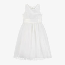 A delightful ivory special occasion dress for baby girls by Sevva. This charming sleeveless style has an embroidered mesh overlay with an appliqué floral design around the waist and diamanté details for added sparkle. Lined in silky satin, it has a voluminous layered tulle skirt with a high-low hemline for a stylish look. Fastening with a concealed zip on the back, it has satin ties that secure into a pretty bow for a lovely finish.