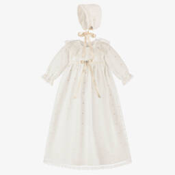 A beautiful white ceremony gown and bonnet set for baby girls by Sevva. The bodice is made from smooth satin with a tulle overlayer, and the long skirt is crafted from layers and layers of lightweight tulle. Beautifully embroidered with gorgeous floral motifs, it is decorated with faux pearls, beads, and transparent sequins for extra shimmer. Fastening neatly with covered buttons on the back, it has a silky lining and puffed short sleeves. The coordinating bonnet has a frilled trim and narrow organza ribbon ties that secure sweetly under the chin.