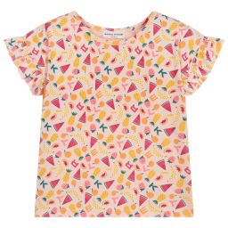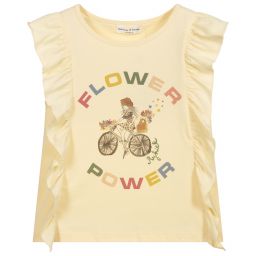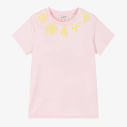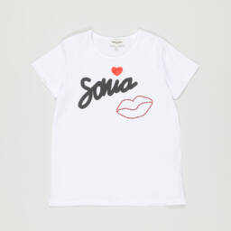 The girls white cotton T-shirt by Sonia Rykiel Paris features a vibrant, glittery floral logo on the front. Crafted from soft, lightweight jersey, it offers a trendy boxy fit with dropped shoulders and capped sleeves. Perfect for casual outings, this top combines comfort and style effortlessly. Limited quantities are available, making it a must-have addition to a spring or summer wardrobe.