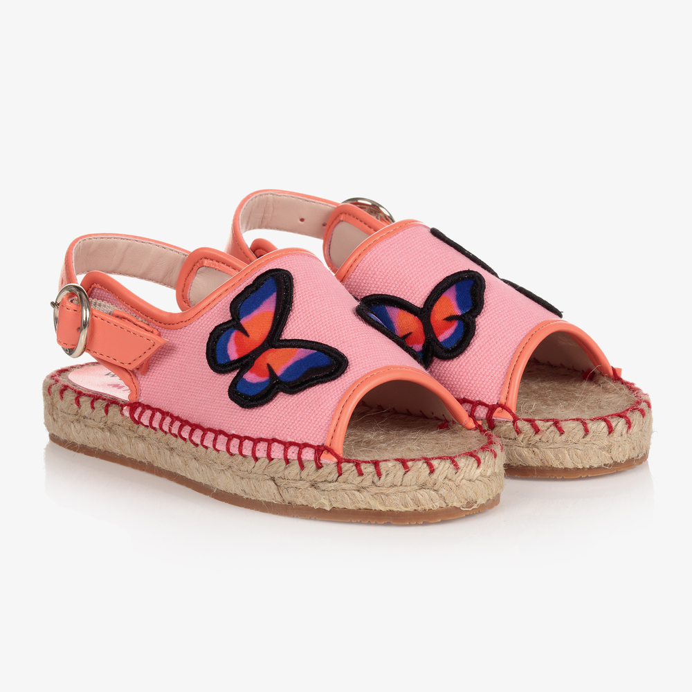Girls pretty espadrille sandals by Sophia Webster Mini, made in pink canvas and with orange faux leather trims. There are colourful butterfly appliqués with embroidered black borders and a pale gold buckle to fasten on the ankle strap. The braided hessian insole and midsole are detailed with red stitchings and come with a non-slip rubber sole for good grip.