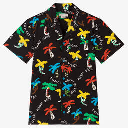 Boys light blue denim shark shirt by Stella McCartney Kids, crafted from soft organic cotton denim. This casual piece features a playful white shark pattern, short sleeves, and a chest patch pocket, with branded buttons for easy fastening. With Stella McCartney's signature small fit, consider sizing up for longer wear. Limited quantities available, so act fast to secure this stylish addition to any young wardrobe.