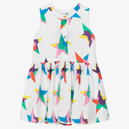 Fun bright blue twill dress for girls by Stella McCartney Kids. This eco-conscious dress is made in soft and lightweight Tencel fibre. Decorating the fabric are cool star prints in a vibrant array of colours. Each front button is a different colour for a cool and quirky look. This sleeveless design features useful front pockets and a dropped waist with a drawstring for a stylish silhouette and comfortable fit.