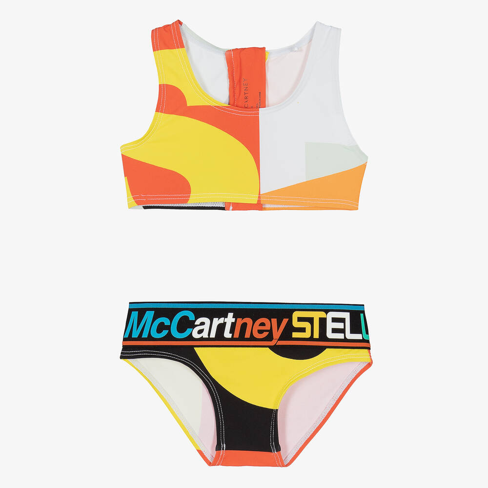 In white, black, orange and yellow, this vibrant colourblock bikini for girls is by Stella McCartney Kids. Using recycled material, it is made in silky smooth fabric with UPF50+. Super comfortable to wear, the top has a back zip fastening with a branded zip puller and the bottoms have an elasticated waist with bold rubberised logo lettering. The Stella McCartney fit can be quite small so choose a size up if you want room to grow.