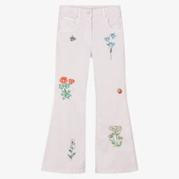 Denim wide-leg trousers for girls by Stella McCartney Kids are crafted from soft organic cotton for a casual yet stylish look. Featuring front and back pockets, classic contrast orange stitching, and a vibrant pink and orange heart-shaped logo appliqué at the back for a playful touch. A hook and zip fastening provides ease, while the adjustable waist offers comfort. Limited quantities available, so do not miss out on this unique piece for the cooler months.