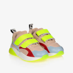 Girls faux leather trainers by Stella McCartney Kids, with pink, red, and black uppers. Lined in soft padded textile, they have rope-style laces and perforated side panels with zigzag stitched detailing. The white and brown non-slip rubber outsoles have a black paint splatter design on the sides and there is a branded tab on the heel for a cool designer finish.